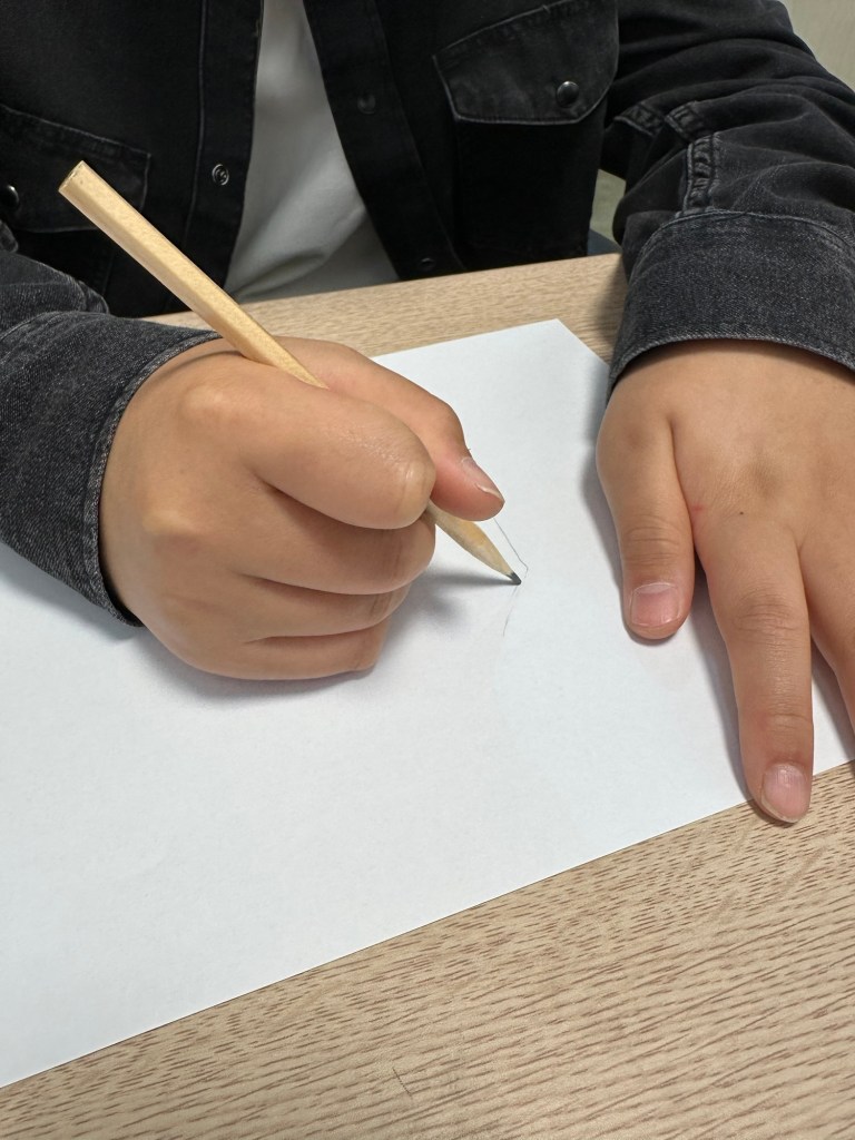 종이를 세로로 놓아요. 휴대폰 타이머를 10초로 맞춥니다. “시작!” 하고 멈추지 말고 위에서 아래로 선을 쭉 내려 그려요. 다 그리면 선을 잠깐 바라봅니다.